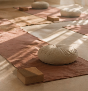 Je ligt of zit comfortabel op een yogamat, in een warme en rustige setting.